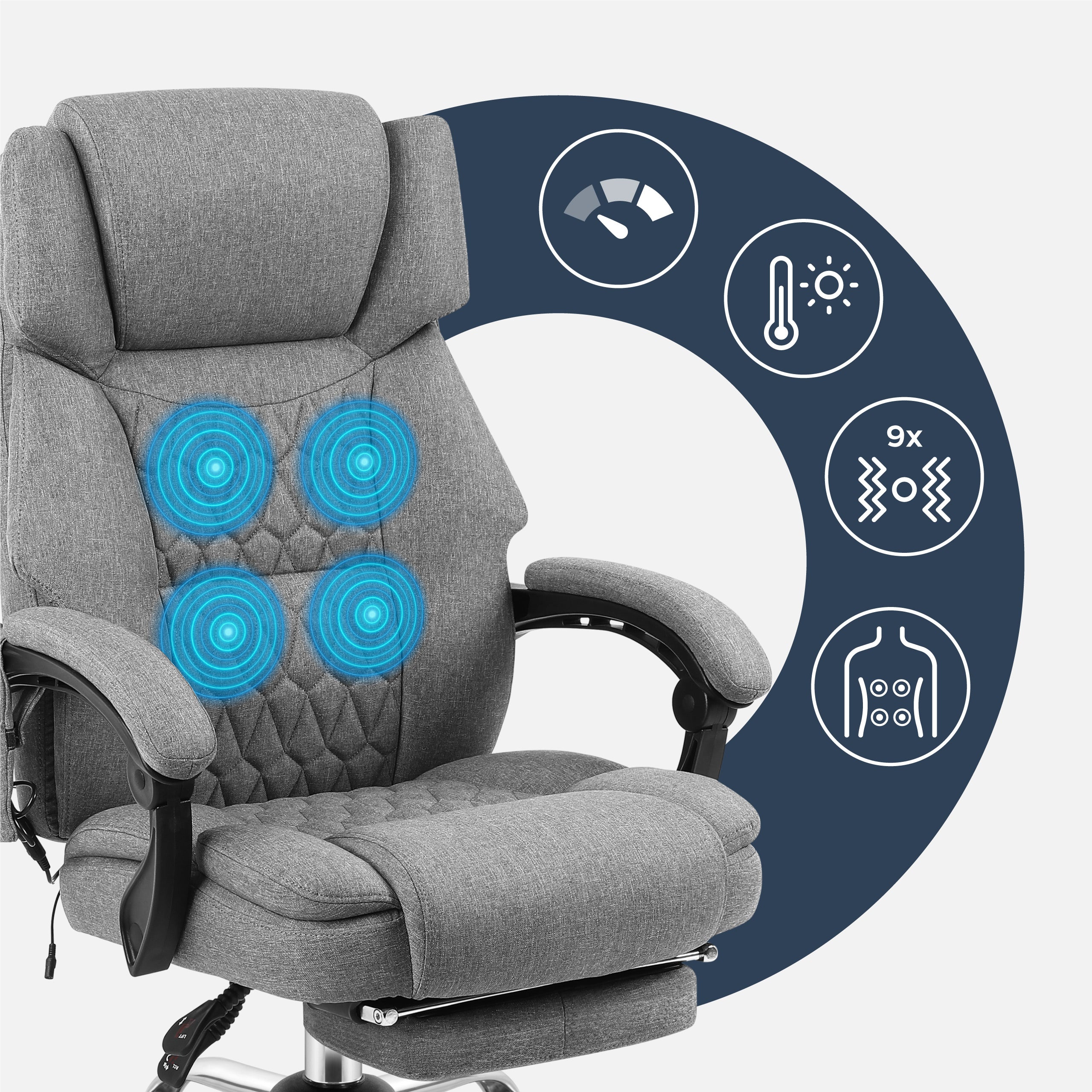 • 4 vibrační motory, umístěné v horní a spodní části zádové opěrky, zaručují komplexní masáž zad.